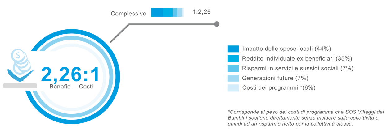 Sulla base dei dati primari (raccolti dalle interviste degli ex-beneficiari) e secondari (raccolti in modalità desk e relativi sia al livello nazionale che locale) - esiste un rapporto costi-benefici di 2,26:1 per il Programma di accoglienza familiare del Villaggio SOS di Vicenza e di 2:1 per quello del Villaggio SOS di Trento.