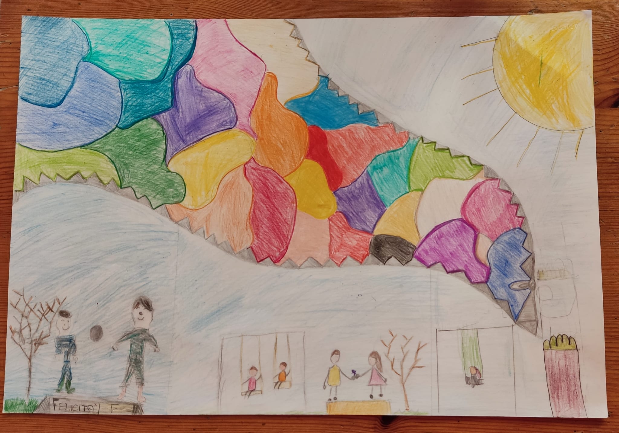 Interessante è il disegno di un/a bambino/a italiano/a che elabora una sorta di tifone, di tromba d’aria che sembra strappare i colori dall’ambiente circostante. Una tromba d’aria con i colori dell’arlecchino e attorno un mondo che ha perduto le sfumature, gli odori, i sapori e la vita.